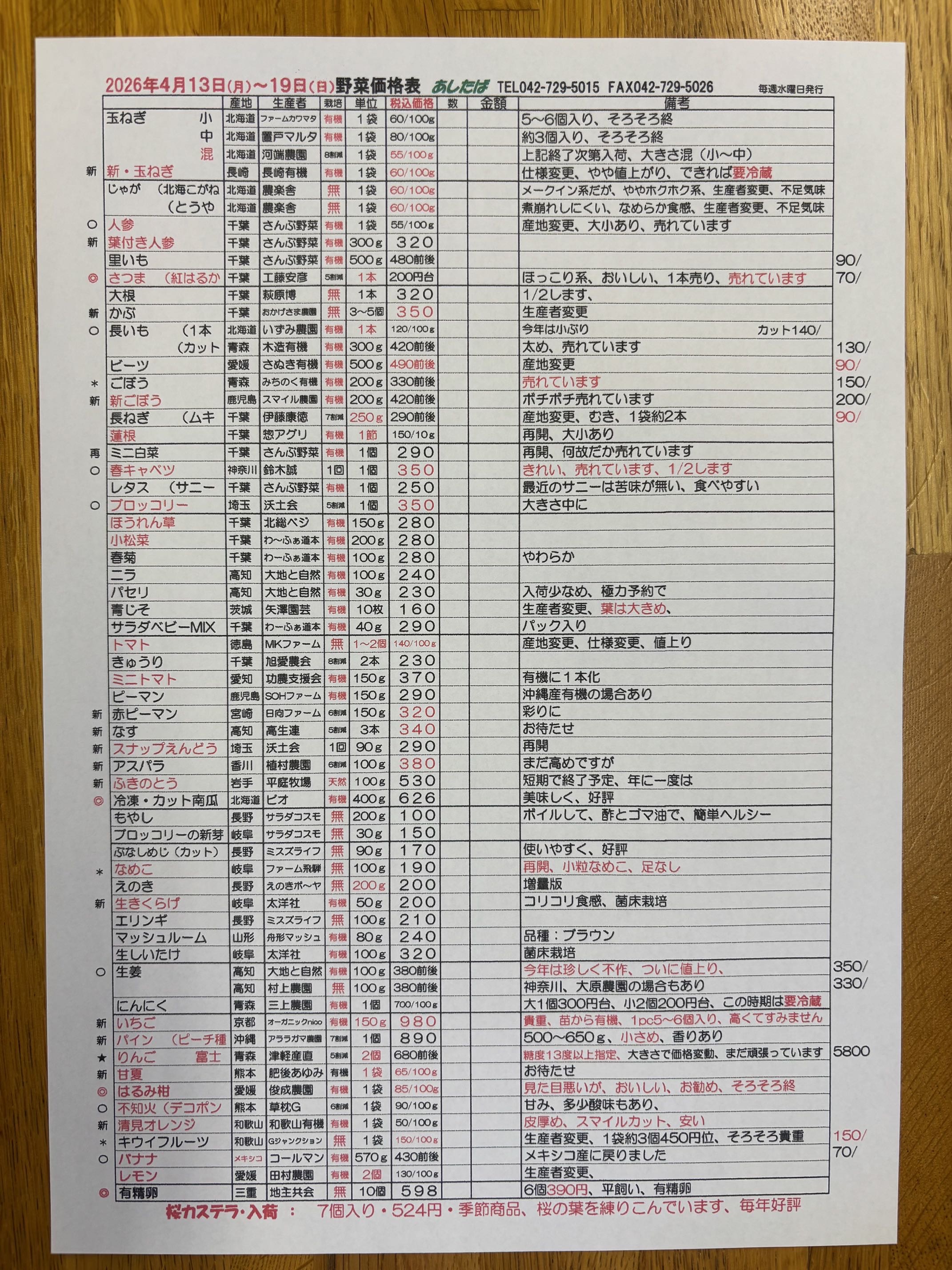 4/13(月)〜4/19(日)野菜入荷予定表です。