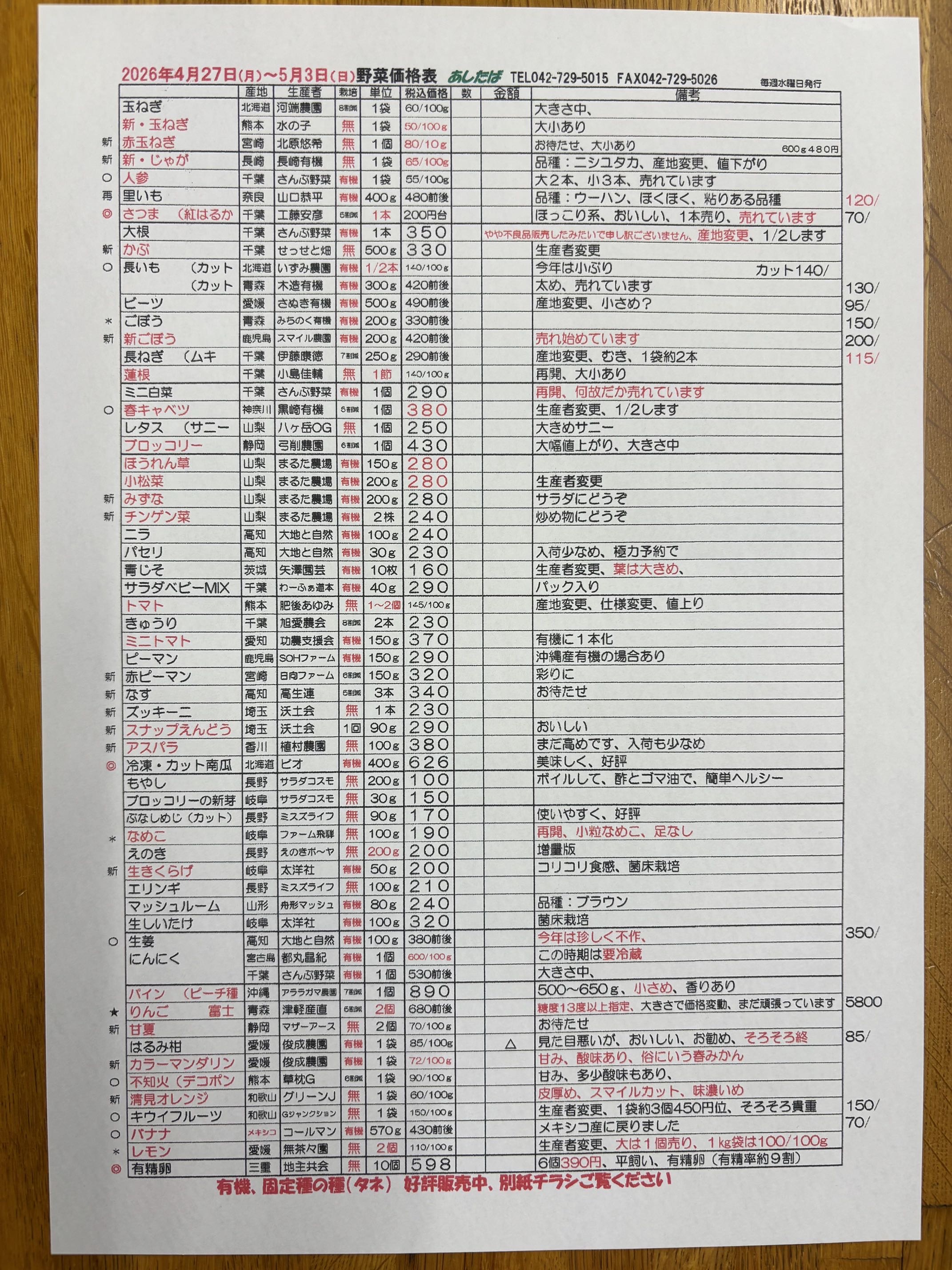4/20(月)〜4/26(日)野菜入荷予定表です。