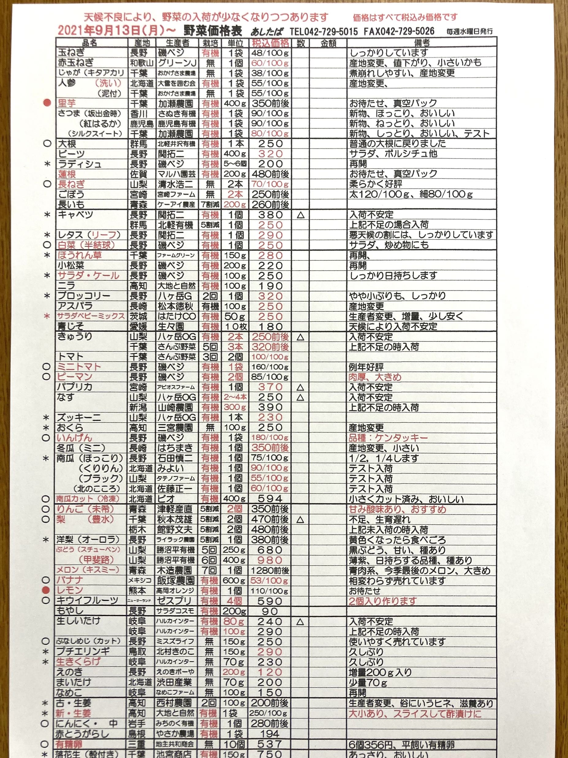 (店舗販売と平行して行っておりますので、お野菜に値札が付いている場合がございます、ご了承下さい。)