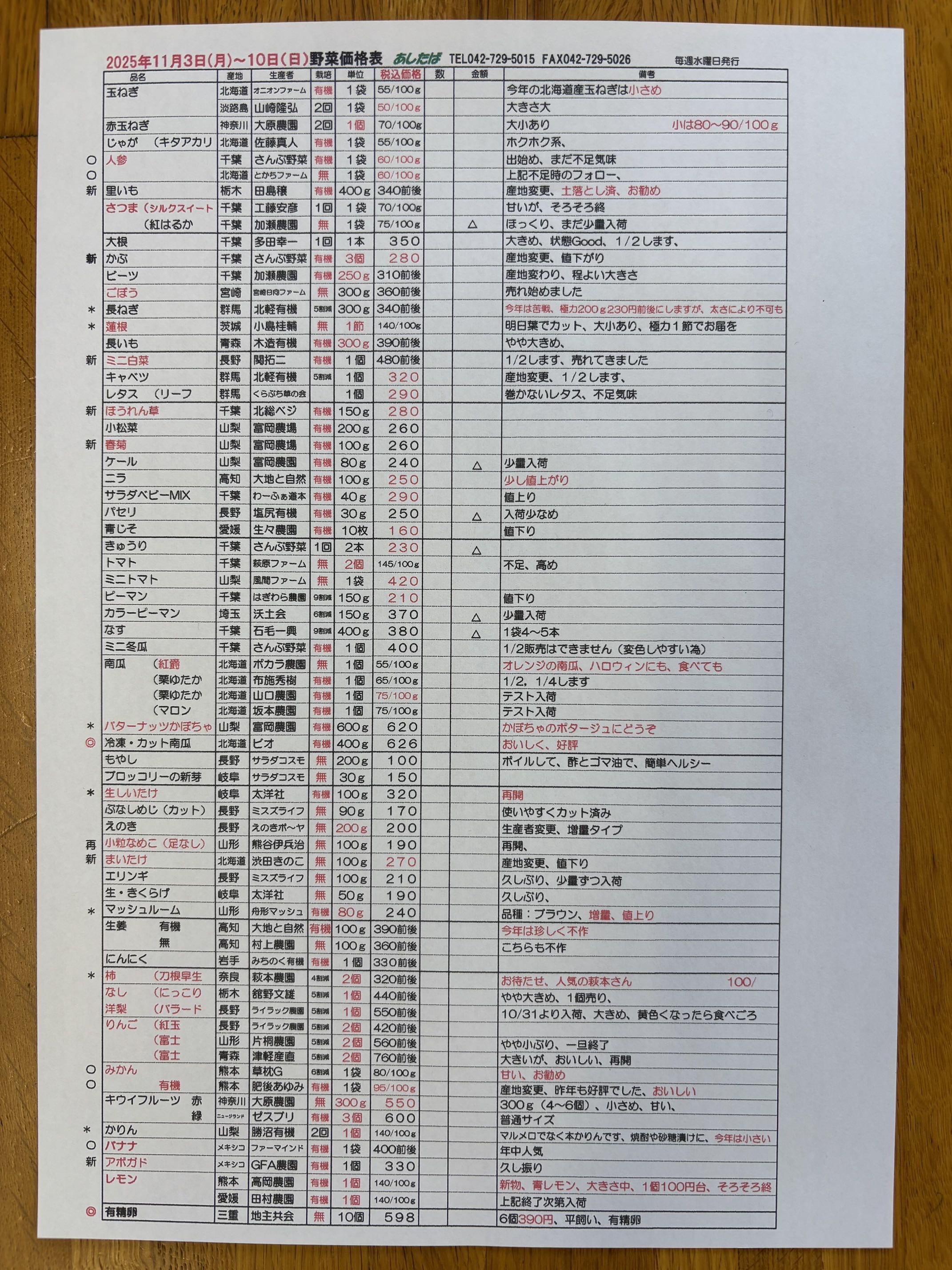 11/3(月)〜11/9(日)野菜入荷予定表です。