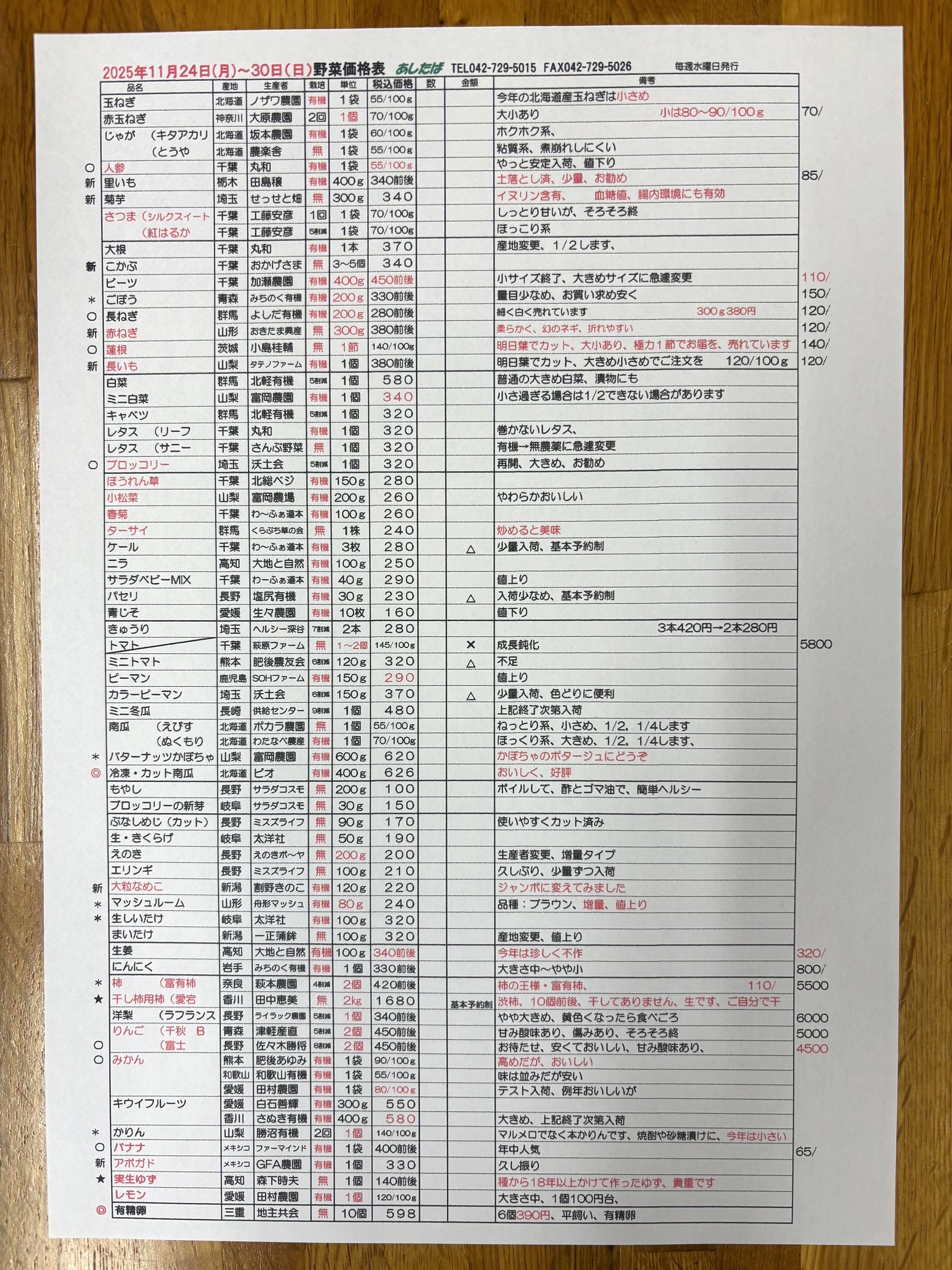 11/24(月)〜11/30(日)野菜入荷予定表です。