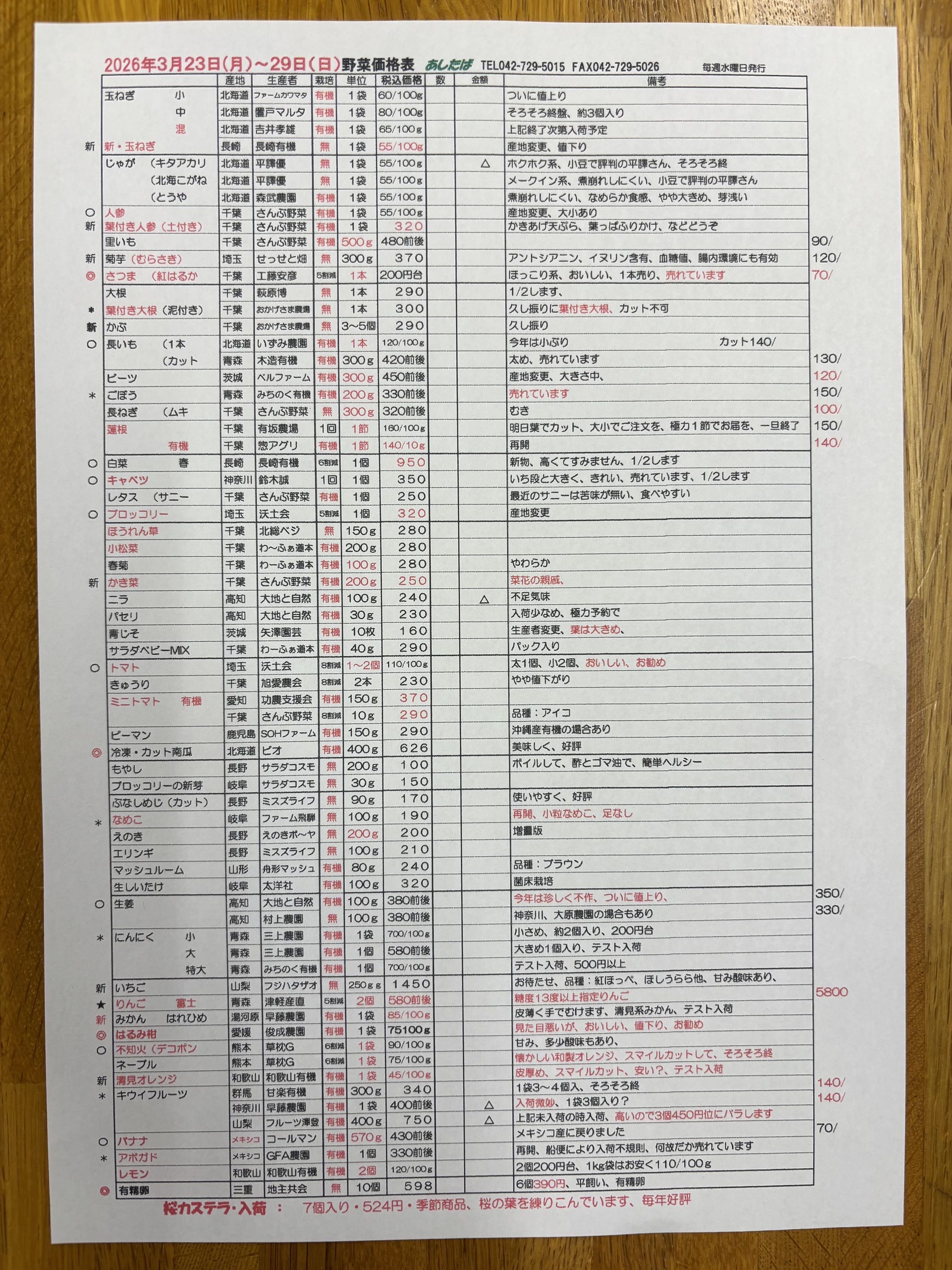 3/23(月)〜3/29(日)野菜入荷予定表です。