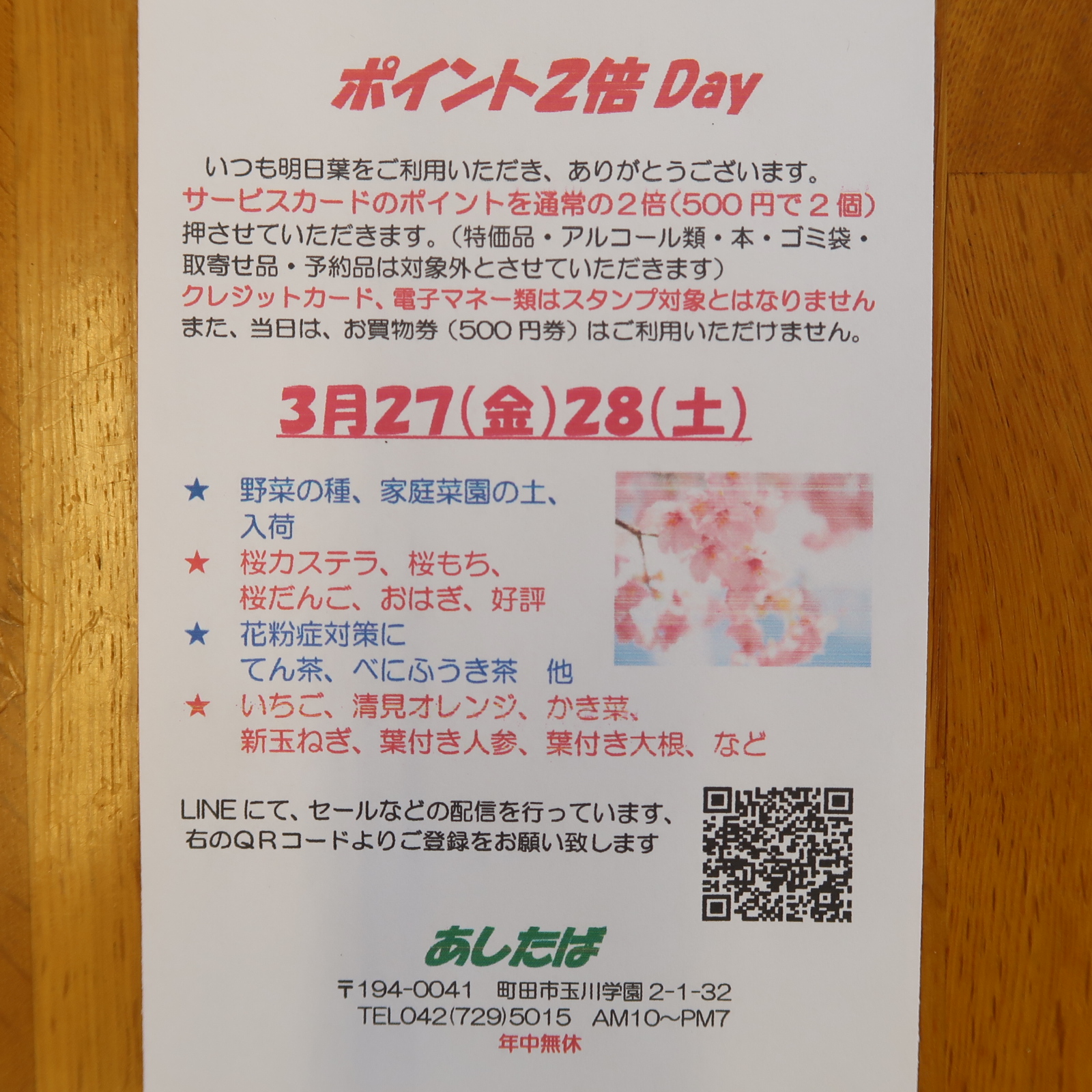 202603/25 ポイント2倍セールのお知らせ 新着情報 自然食品店あしたば ポイント2倍セールのお知らせ 3月27(金)28日(土) AM10:00〜PM7:00 ⭐︎桜カステラ、桜餅、桜だんご、おはぎ、好評 ⭐︎国産自然農法種子、有機種子、家庭菜園の土、入荷 ⭐︎花粉症対策、ジャバラ甜茶、べにふうき茶、など ⭐︎いちご、清美オレンジ、かき菜、新タマネギ、葉付き人参、葉付き大根、など スタッフ一同、みなさまのご来店を心よりお待ちしております! . . #町田 #玉川学園 #自然食品店あしたば 共有:クリックして Twitter で共有 (新しいウィンドウで開きます)Facebook で共有 (新しいウィンドウで開きます)クリックして Google+ で共有 (新しいウィンドウで開きます) 関連