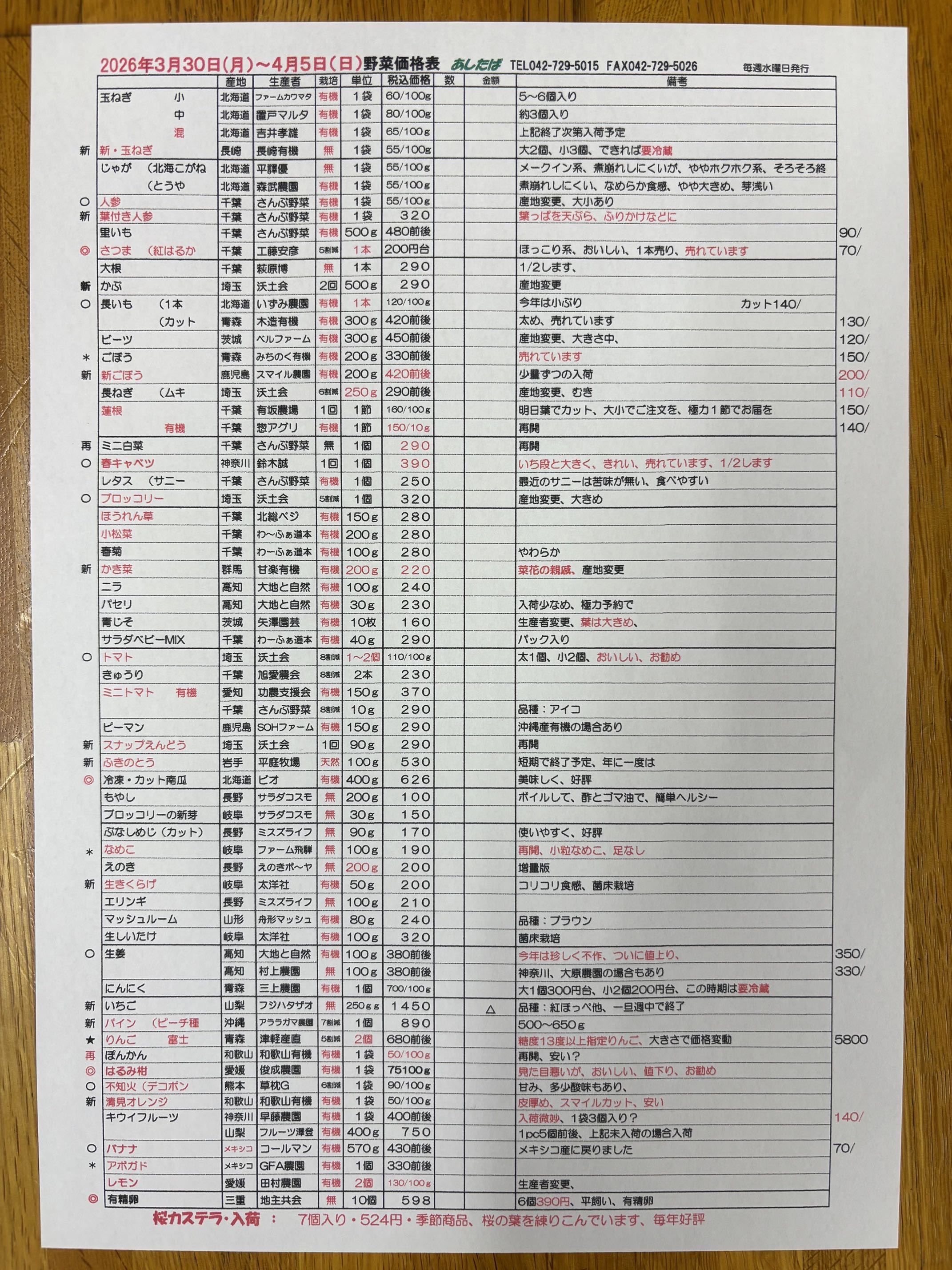 3/30(月)〜4/5(日)野菜入荷予定表です。