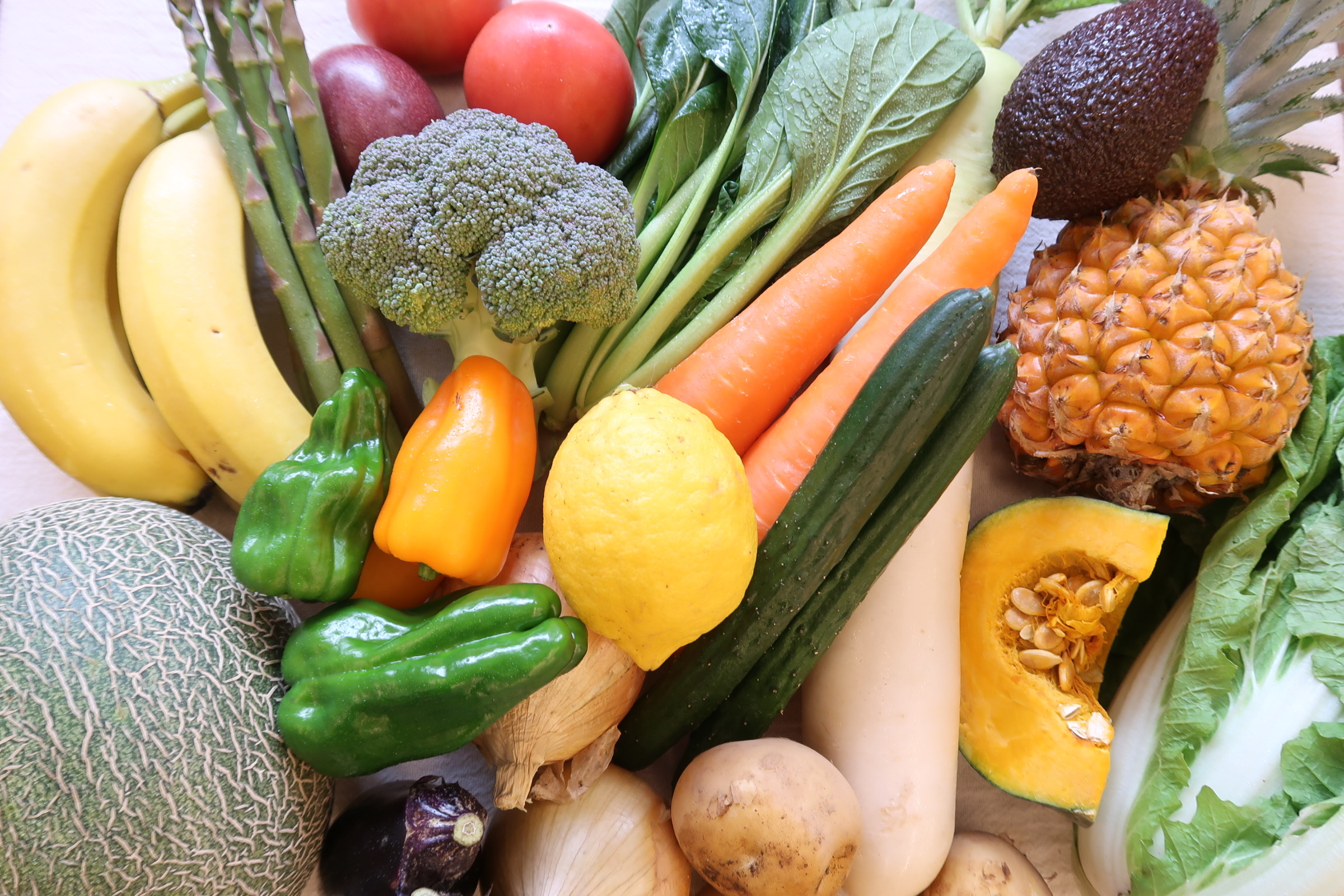 (例)玉ねぎ(約500g)人参(500g)じゃがいも(500g)小松菜、ほうれん草、トマト、きゅうり、キャベツ、ピーマン、かぼちゃ4/1、しめじ、バナナ(1房)りんご(2玉)ミニパイナップル、小玉メロン