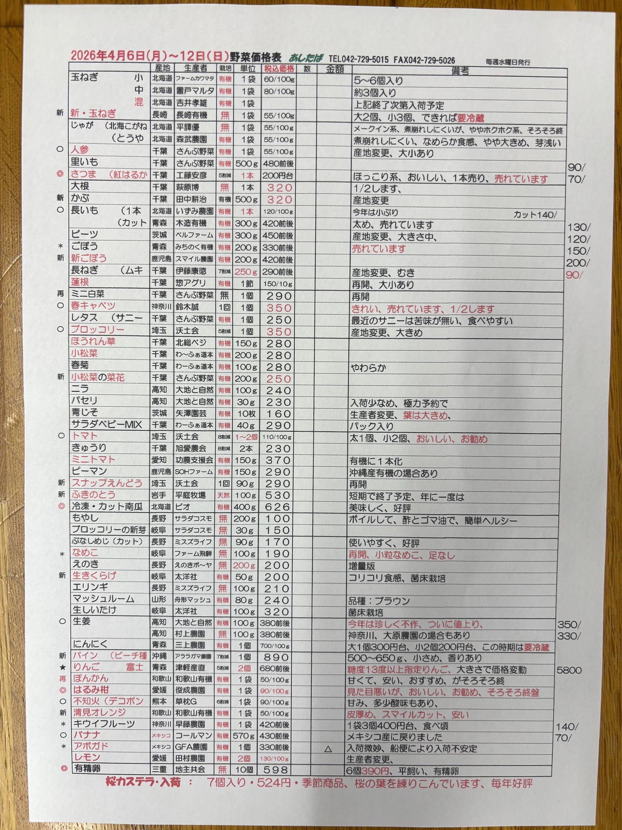 4/6(月)〜4/12(日)野菜入荷予定表です。