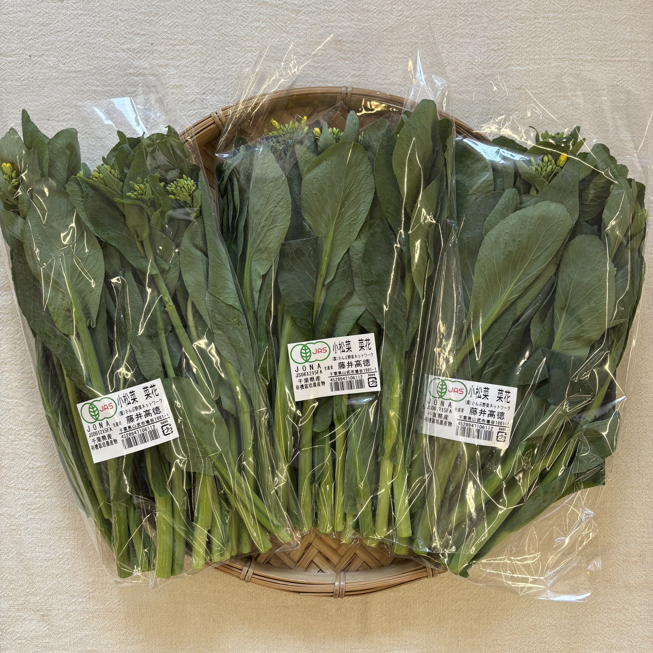 202604/07 有機小松菜の菜花、入荷です 新着情報 今週は小松菜の菜花も入荷しています。 アブラナ科特有のほろ苦さと甘さ、シャキシャキの食感はこの季節ならでは♪ 菜の花はアブラナ科の黄色い花の総称なのでいろいろな菜花がありますが、小松菜の菜花はまた珍しく販売する期間もほんの少しです。 ポン酢でおひたしや、和え物にして、いつもの小松菜とはまた一味違った味わいをぜひお召し上がりください . . ▪︎品目 小松菜の菜花 ▪︎産地 千葉 ▪︎生産者 さんぶ野菜 ▪︎栽培区分 有機栽培 共有:クリックして Twitter で共有 (新しいウィンドウで開きます)Facebook で共有 (新しいウィンドウで開きます)クリックして Google+ で共有 (新しいウィンドウで開きます) 関連